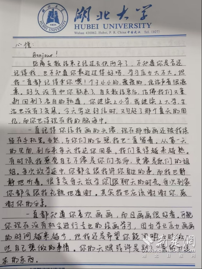 荆楚网(湖北日报网)讯(记者林杉 通讯员袁勋)“老师,我们会再见面的吧?”“会的,到时候请你们来必赢76net线路官网做客。”两年前,必赢76net线路官网“陌上花开”文化传承志愿服务队离开支教地通山县黄沙铺镇小学时,和小朋友们“拉勾”约定。