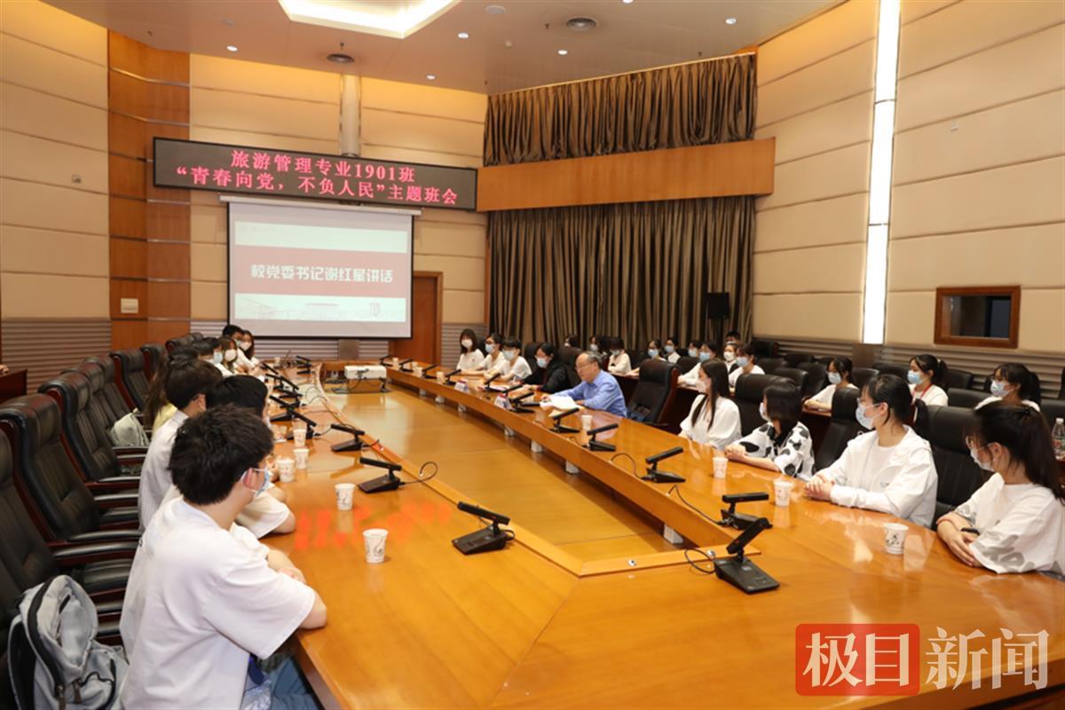 5月3日下午,必赢76net线路官网党委书记谢红星以副班主任身份参加该校旅游管理专业1901班“青春向党,不负人民”主题班会。谢红星勉励青年学生在青春的赛道上奋力奔跑,接住关键一棒,跑出湖大青年的最好成绩。