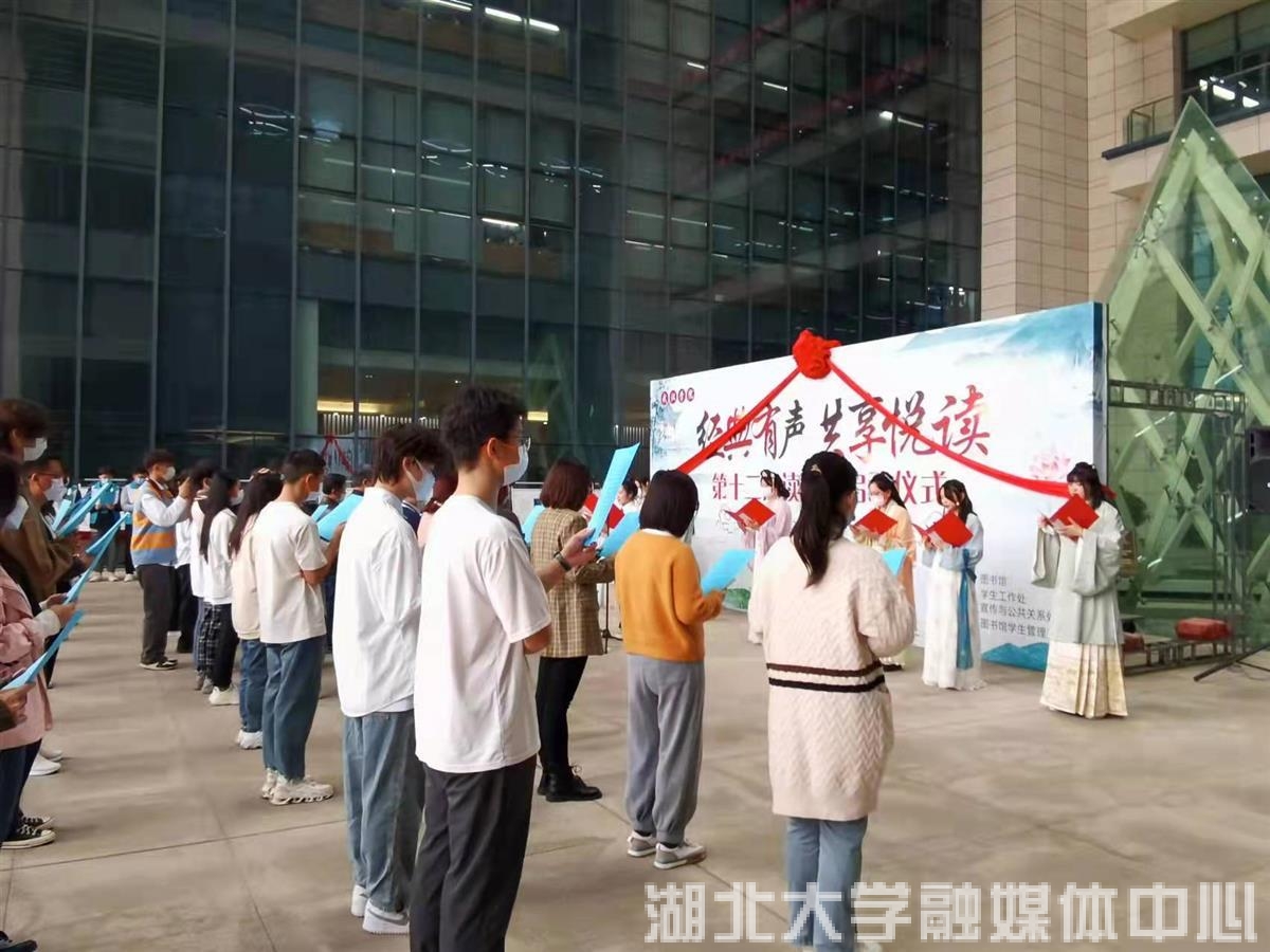 3月30日,在武汉学院陈一丹伉俪图书馆前,在几位身穿汉服的学生领诵下,大学生代表齐诵国学经典《大学》,并纷纷在“每天读书一小时”倡议横幅上签名。该校第12届读书月活动由此开启,将以“经典有声 共享悦读”为主题,相继举办“百部经典”阅读打卡、传统文化知识竞赛、“因书而美”主题书展、书库寻宝、“图书馆之星”评选等活动。
