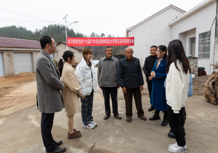 深入推进党史学习教育,必赢76net线路官网再出新招。12月15日,该校师生宣讲团在校党委副书记侯勇带领下,来到该校乡村振兴驻点的英山县石头咀镇大屋冲村,进村入户宣讲党的十九届六中全会精神,驻村工作队精心组织7个村近40名党员在家门口上了一堂生动党课。