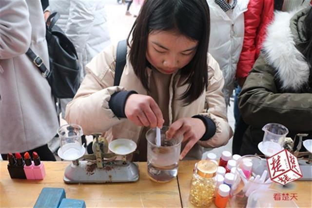 活动刚开始,现场就被等待制作口红的女生围了起来,半天就吸引了300人参与。“先加0.5g口红粉,根据自己的喜好调配颜色,再加入3.4g左右的杏仁油,最后加入0.8g的白蜂蜡和0.2g的树蜡来固定口红的形态,加入一粒维生素E调节口红的滋润度,最后再经水浴加热溶解,搅拌均匀后快速倒入模具,冷却后就制作成功啦!”活动负责人、该校2016级旅游管理专业于澳郡给大家讲解了口红的制作过程。
