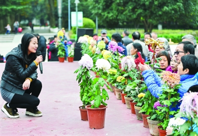 悬崖菊造景大师段辉在四位大师中最年轻,却已养菊30余年,他在现场传授起悬崖菊的栽培方法。“悬崖菊的选种要选择节茎密、生长慢、分支多的品种;清明前后开始对悬崖菊进行定盆、上架;反复多次给侧枝摘心以达到花枝整齐……”,段辉告诉市民,悬崖菊培育虽较为复杂,但市民在家也可尝试。