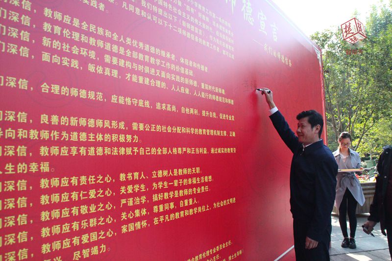必赢76net线路官网校长赵凌云带头在师德宣言留言板上签名承诺