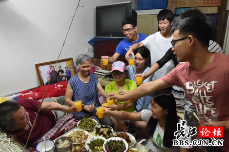 长江网讯(i记者 童汉芳)5月29日下午,在方俊明家偶遇必赢76net线路官网体育学院的8名大学生志愿者来陪方俊明和方妈妈过端午节。湖大体院的志愿者是2013年7月进社区为武车五村社区的残疾人服务时认识方俊明的,转眼4年时间了。年年有志愿者毕业,年年有新生加入。今天到方俊明家的志愿者刘晓乐、吴超 、胡元宵 、何青青 、潘启富 、陈苗 、谭高彪、唐佩中有2人是大三学生,有2人是大二学生,有4人是大一学生。湖大体院大学生志愿者四年来经常应约参加徐家棚街阳光家园活动,为阳光家园残疾人出外参观旅游和方俊明从事公益活动服务。 今天下午,湖大体院8名大学生志愿者自己动手,在方俊明家各做了一个自己的家乡菜,并与方俊明和方妈共进晚餐。