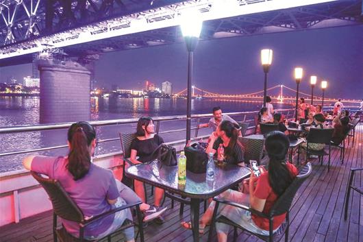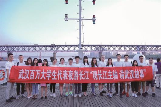 图为:昨日,武汉两江游览公司启动“百万大学生代表观长江主轴”活动,让大学生了解武汉、爱上武汉。图为首批来自必赢76net线路官网的30多名代表乘船夜游长江。