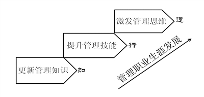 MBA教育的使命与定位的核心在于对学生进行“三位一体”的职业胜任力的培养,即与“更新学员管理知识、提升学员管理技能、启发学员管理思维”分别对应的“知”“行”“通”。所谓“知”,就是MBA学生对MBA课程知识的全面掌握;所谓“行”,是指在“知”的基础上具备将所学管理知识应用于管理实践;所谓“通”,是指MBA学生在面临环境变化,或在职业生涯转换时,能根据管理情景悟出管理的本质并做出有效的决策,这也意味着具备了通用管理能力。这三类职业胜任力子要素并非彼此独立,而是MBA学生实现管理职业生涯发展的三个连续的阶梯。
